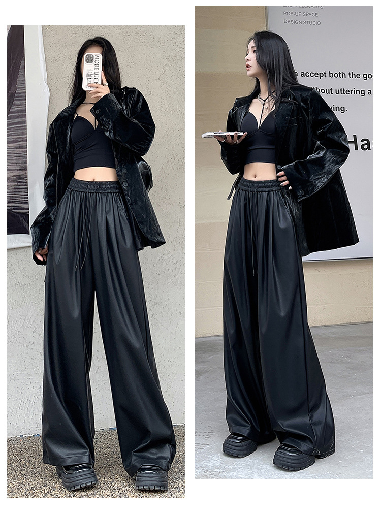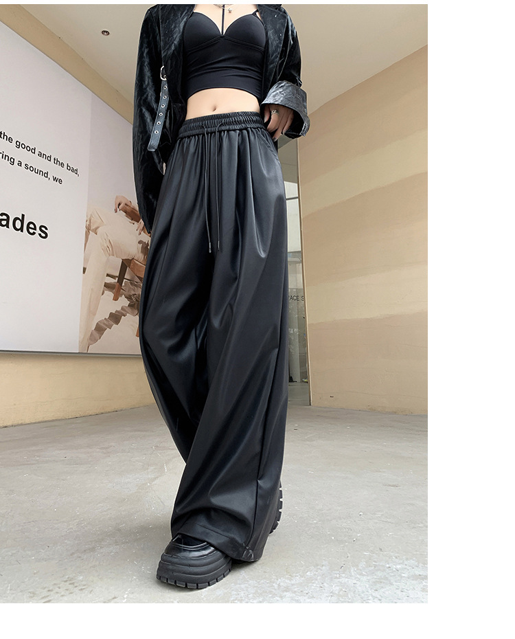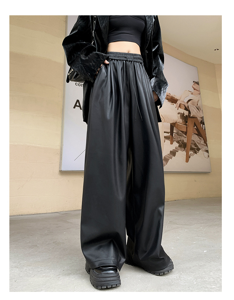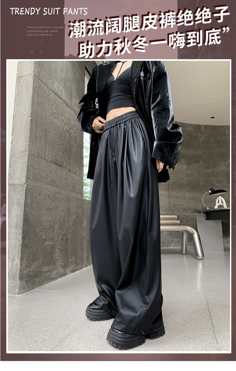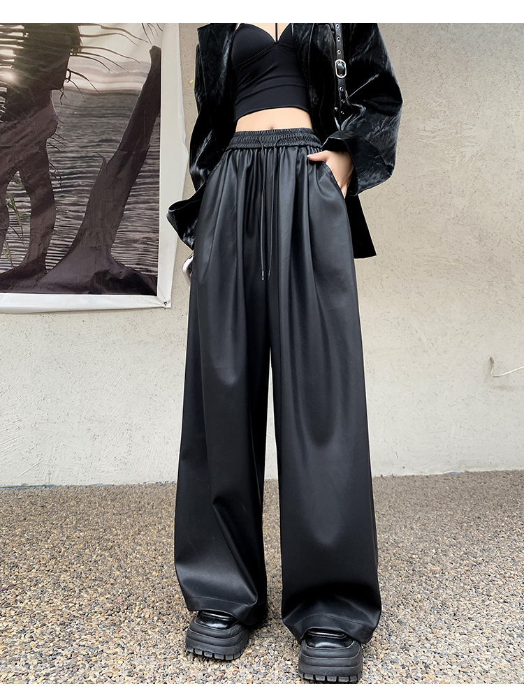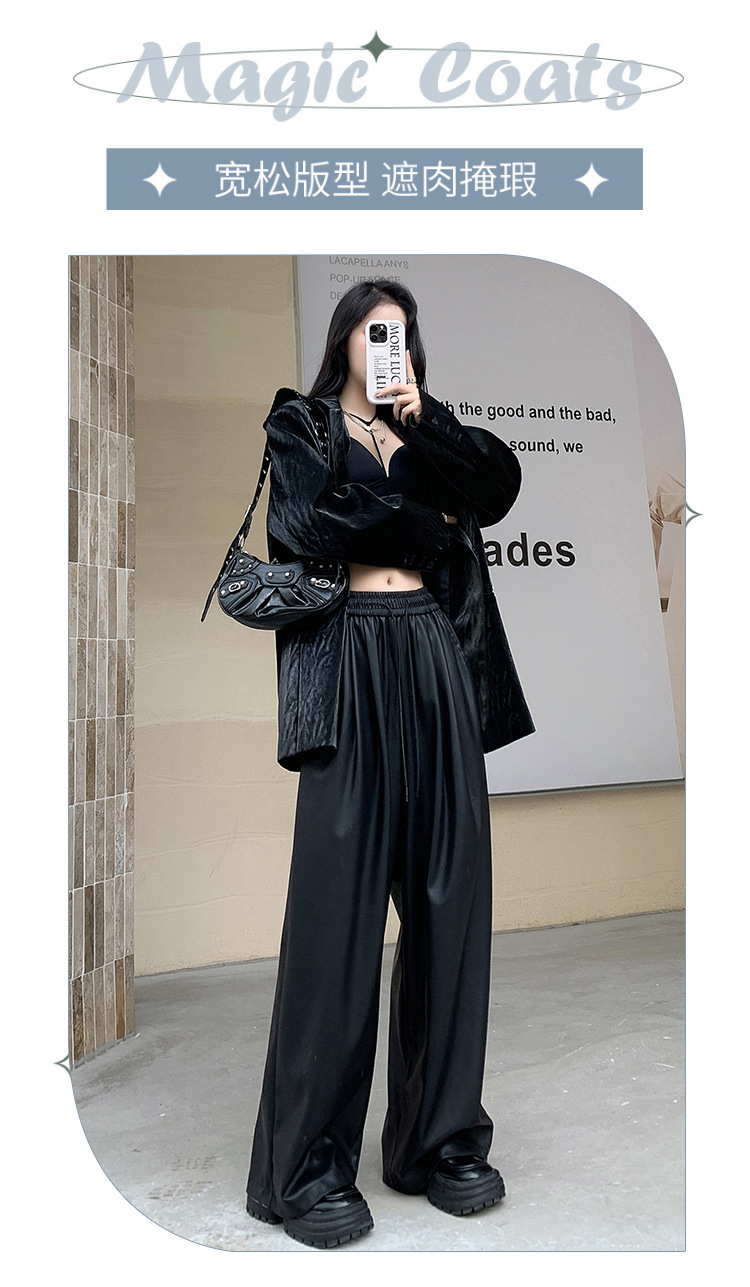 美式皮裤女复古宽松显瘦休闲裤抽绳哑光PU皮阔腿拖地裤潮