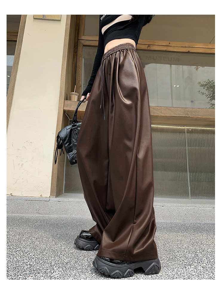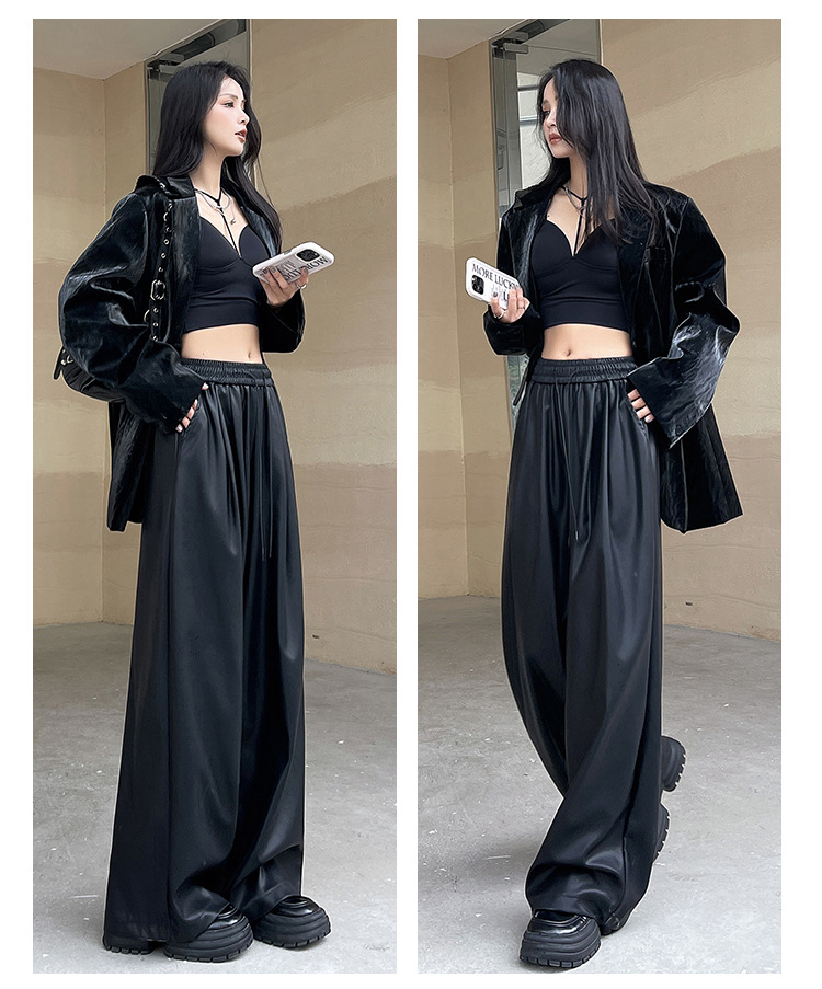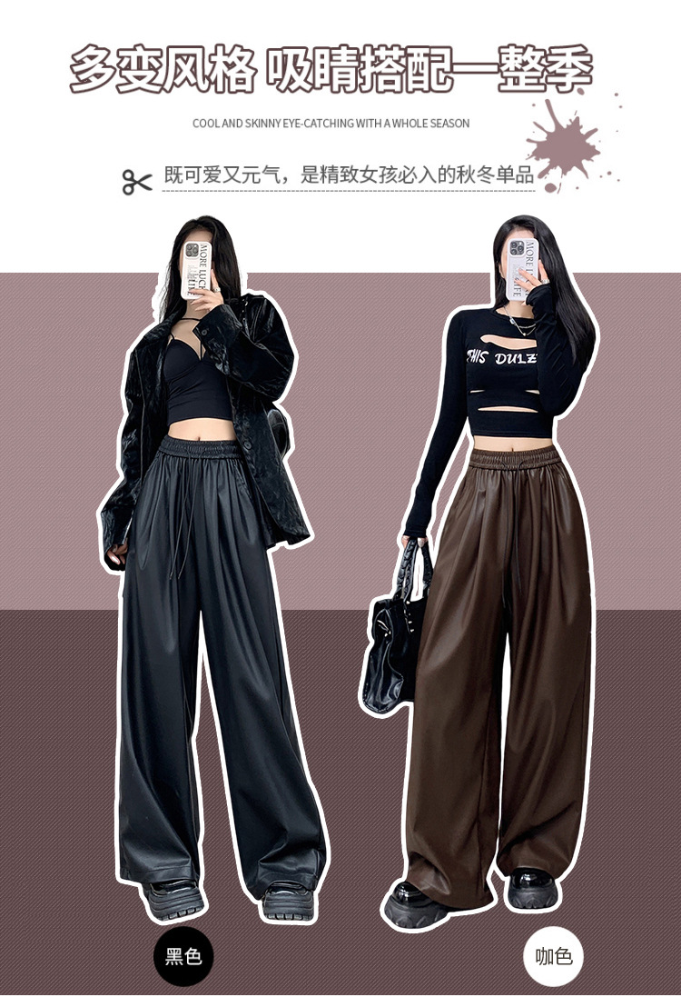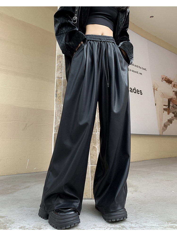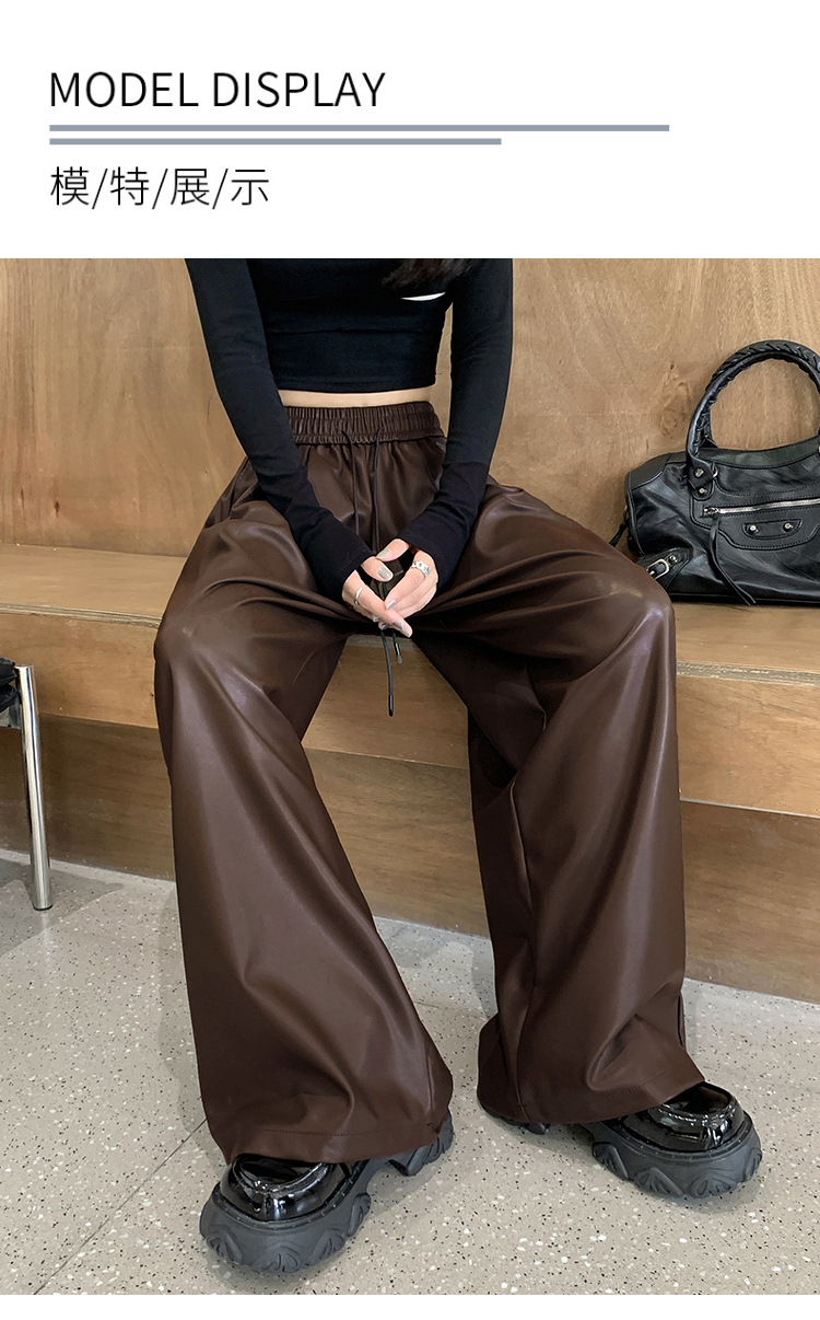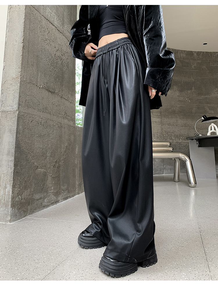 美式皮裤女复古宽松显瘦休闲裤抽绳哑光PU皮阔腿拖地裤潮