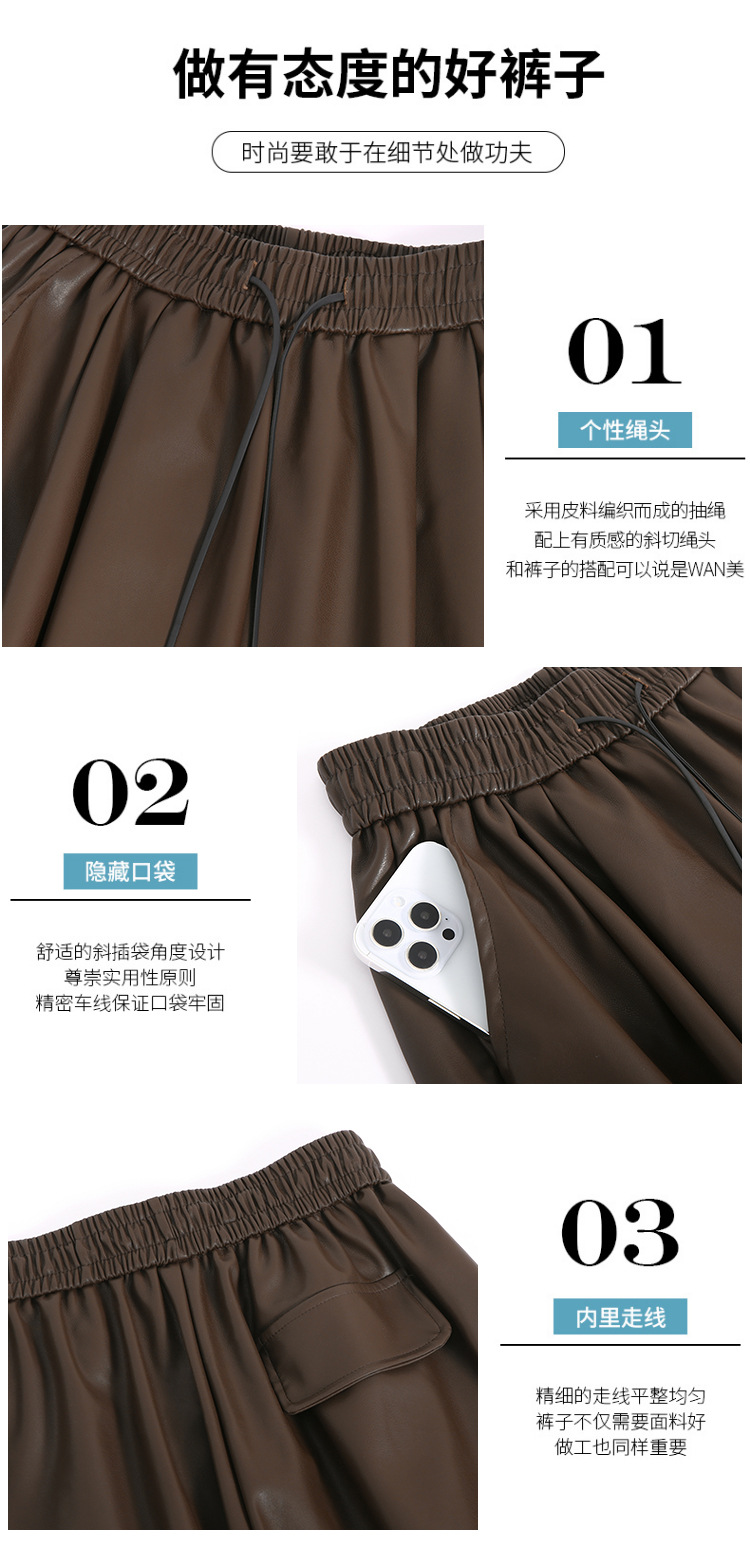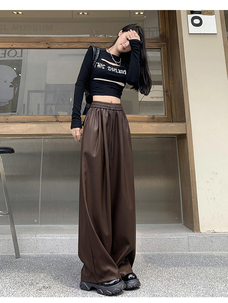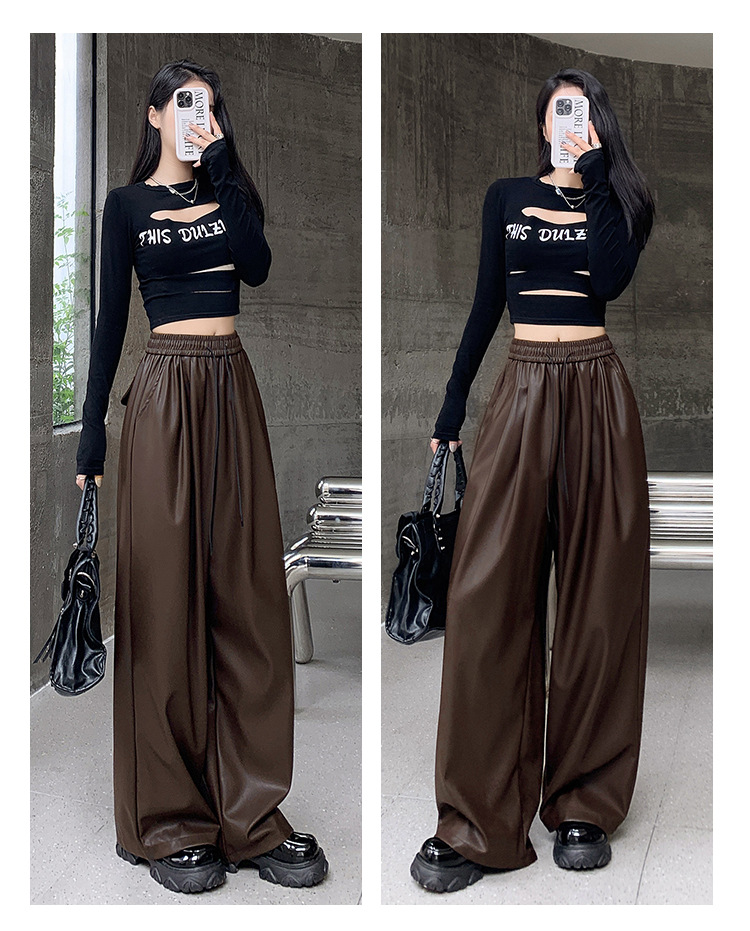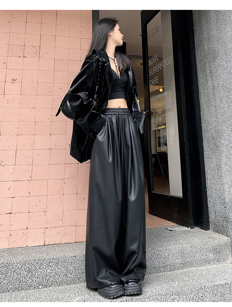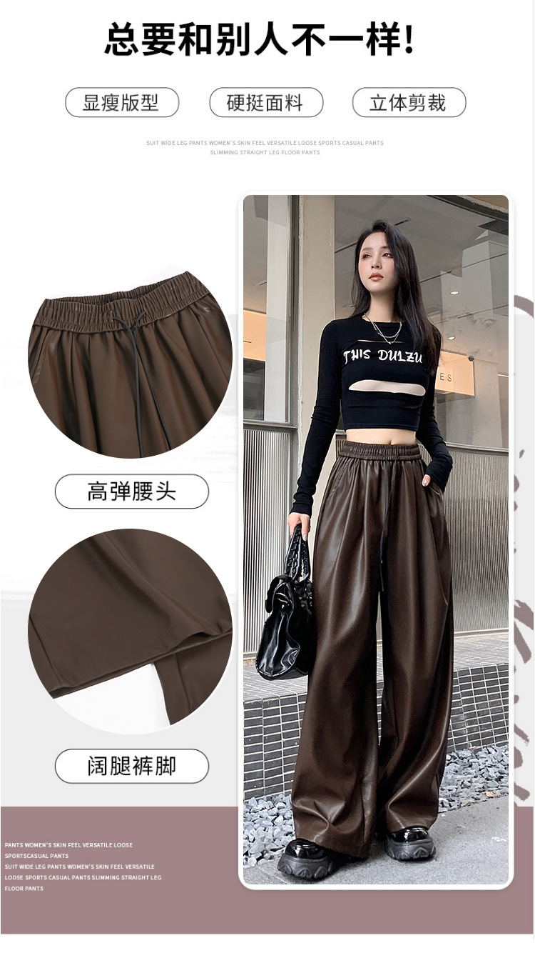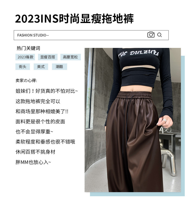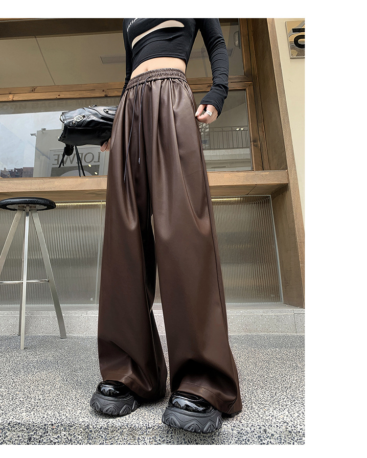 美式皮裤女复古宽松显瘦休闲裤抽绳哑光PU皮阔腿拖地裤潮